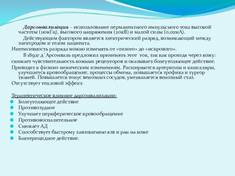 Дарсонвализация – использование перманентного импульсного тока высокой частоты (110кГц), высокого напряжения