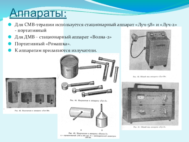 Для СМВ-терапии используется стационарный аппарат «Луч-58» и «Луч-2» - портативный