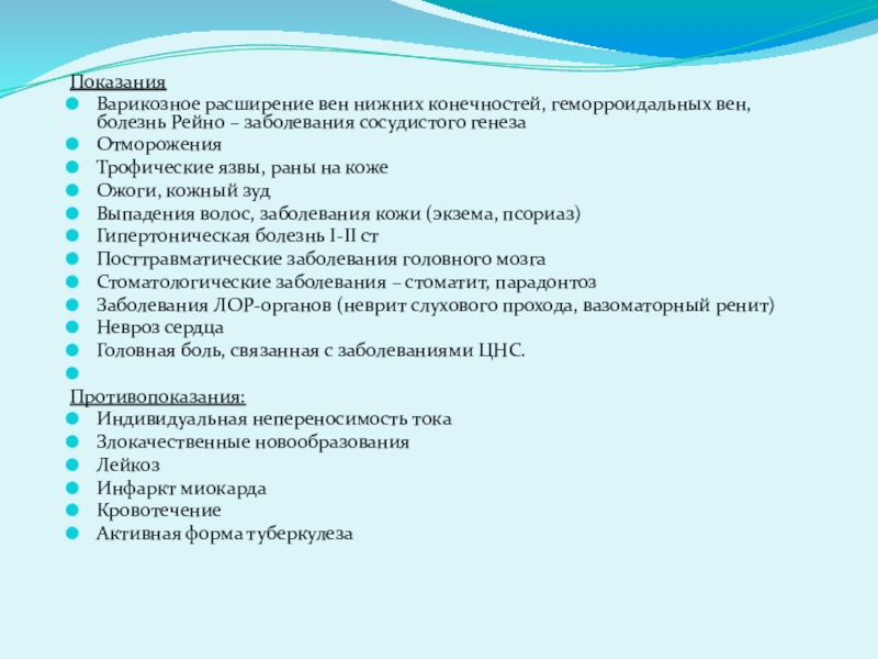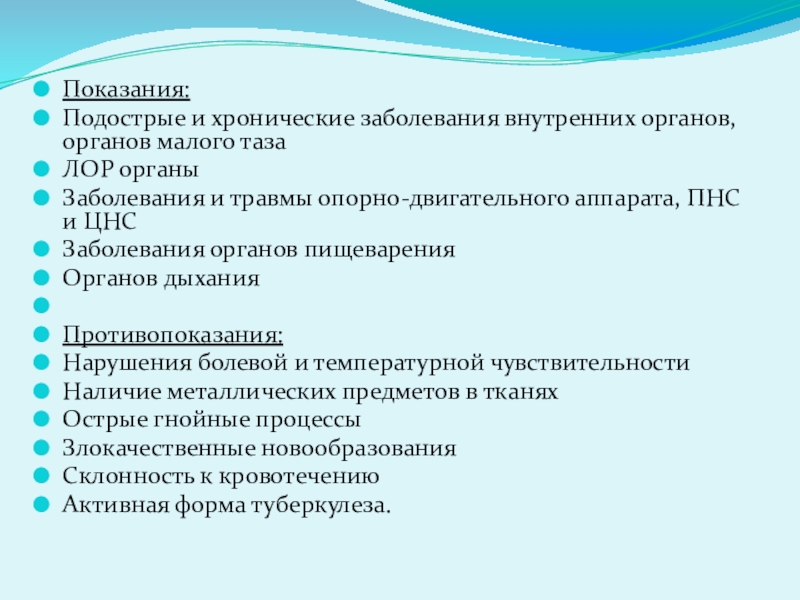 Противопоказания: как при УВЧ-терапии + тиреотоксикоз, катаракта, глаукома.