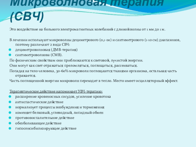 В лечении используют микроволны дециметрового (0,1-1м) и сантиметрового (1-10 см) диапазонов, поэтому различают 2 вида СВЧ: