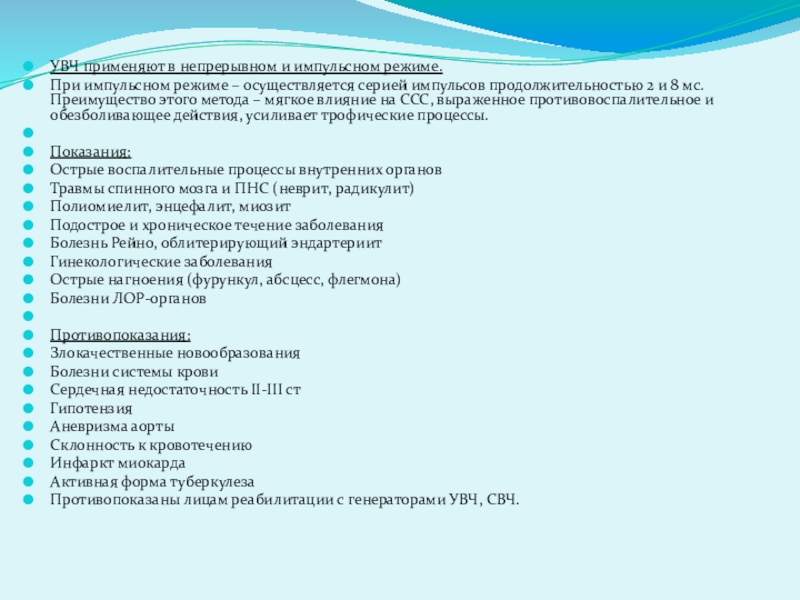 серией импульсов продолжительностью 2 и 8 мс. Преимущество этого метода – мягкое влияние на ССС, выраженное противовоспалительное и обезболивающее действия, усиливает трофические процессы.
