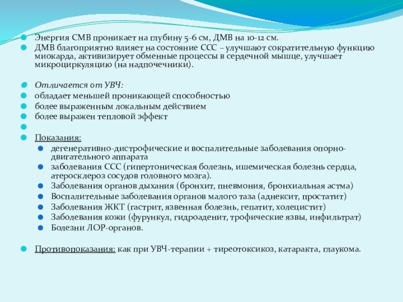Энергия СМВ проникает на глубину 5-6 см, ДМВ на 10-12 см.