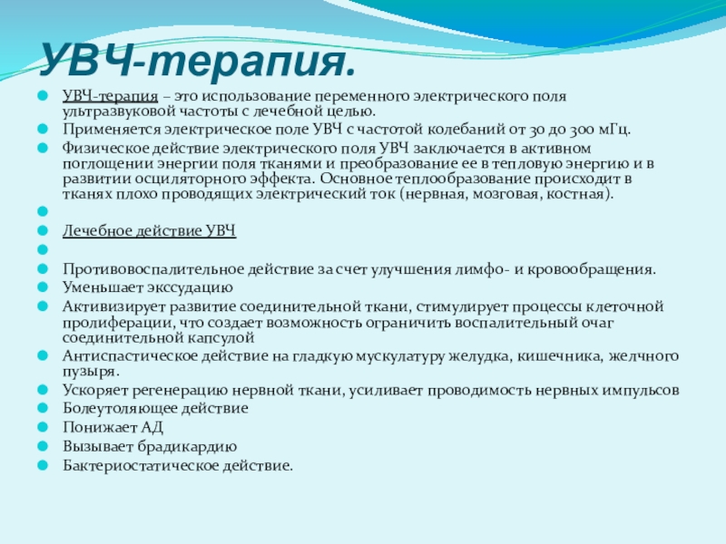 Физическое действие электрического поля УВЧ заключается в активном поглощении энергии поля тканями и преобразование ее в тепловую энергию и в развитии осциляторного эффекта. Основное теплообразование происходит в тканях плохо проводящих электрический ток (нервная, мозговая, костная).