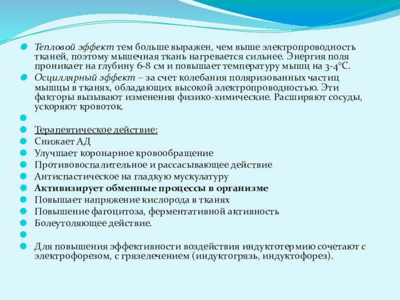 Осциллярный эффект – за счет колебания поляризованных частиц мышцы в тканях, обладающих высокой электропроводностью. Эти факторы вызывают изменения физико-химические. Расширяют сосуды, ускоряют кровоток.