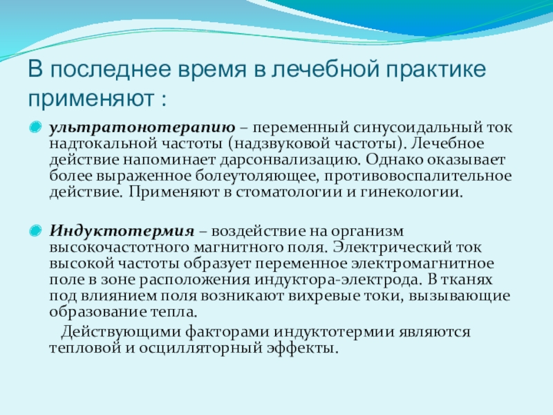 ток надтокальной частоты (надзвуковой частоты). Лечебное действие напоминает дарсонвализацию. Однако оказывает более выраженное болеутоляющее, противовоспалительное действие. Применяют в стоматологии и гинекологии.