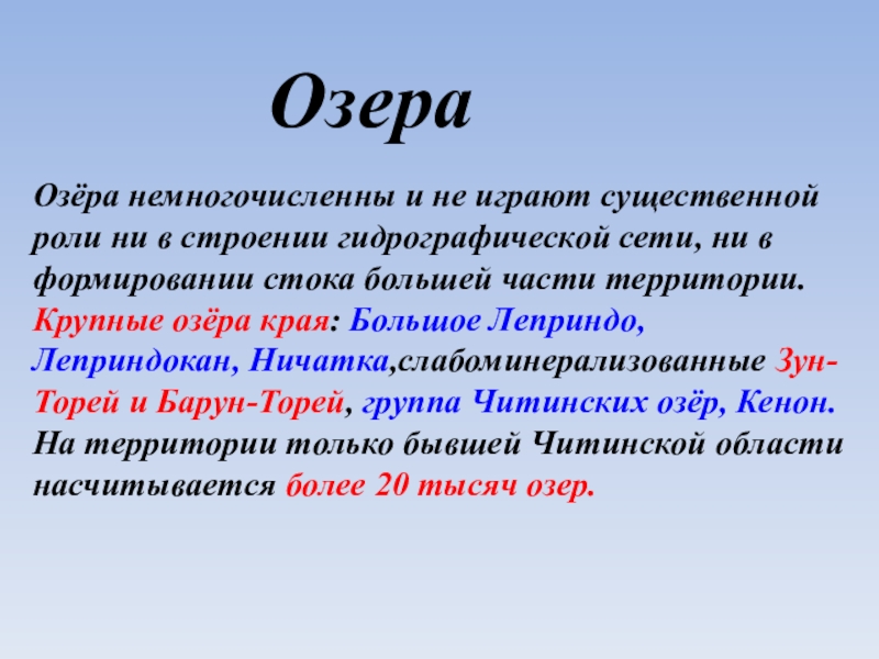 Крупные озёра края: Большое Леприндо, Леприндокан, Ничатка,слабоминерализованные Зун-Торей и Барун-Торей, группа Читинских озёр, Кенон.