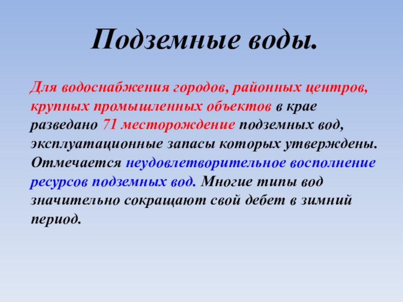 Подземные воды.Для водоснабжения городов, районных центров, крупных промышленных объектов в крае разведано 71 месторождение подземных вод, эксплуатационные