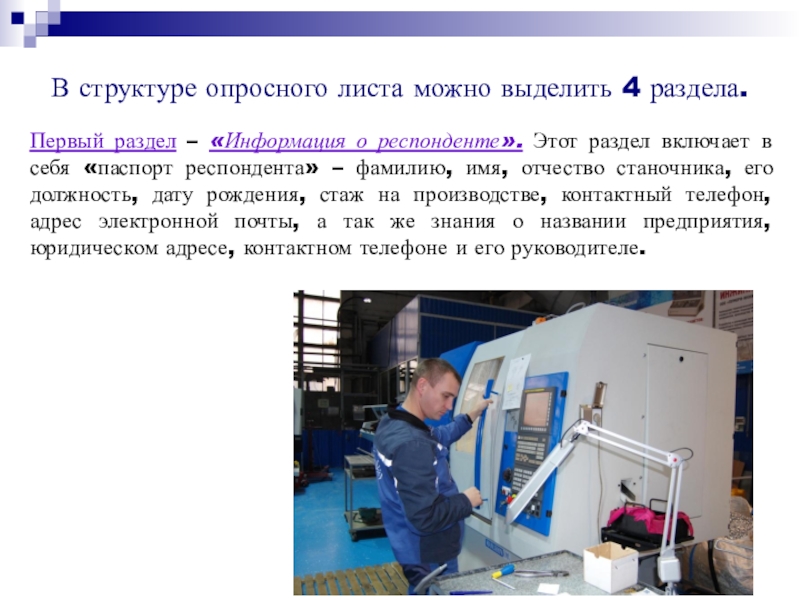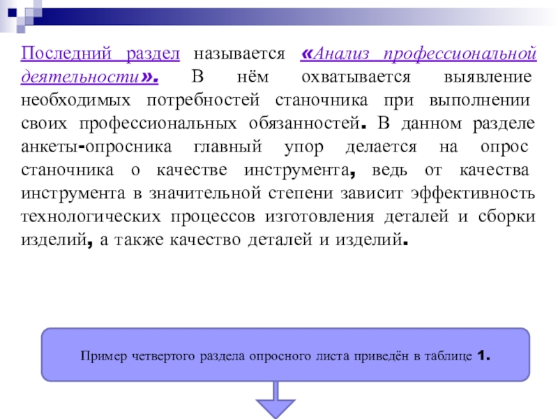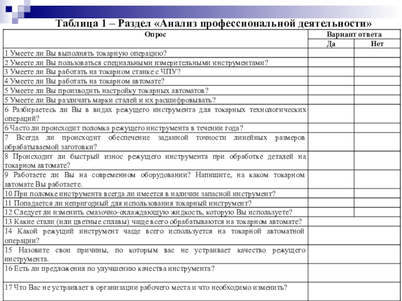 Пример четвертого раздела опросного листа приведён в таблице 1.