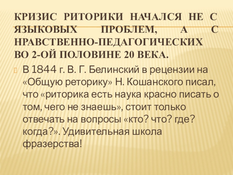 В 1844 г. В. Г. Белинский в рецензии на «Общую реторику» Н. Кошанского писал, что «риторика есть наука красно писать о том, чего не знаешь», стоит только отвечать на вопросы «кто? что? где? когда?». Удивительная школа фразерства!
