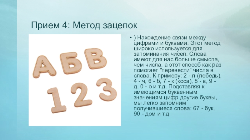 Этот метод широко используется для запоминания чисел. Слова имеют для нас больше смысла, чем числа, а этот способ как раз помогает "перевести" числа в слова. К примеру: 2 - л (лебедь), 4 - ч, 6 - б, 7 - к (коса), 8 - в, 9 - д, 0 - о и т.д. Подставляя к имеющимся буквенным значениям цифр другие буквы, мы легко запомним получившиеся слова: 67 - бук, 90 - дом и т.д