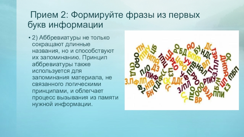 Слайд 4 Прием 2: Формируйте фразы из первых букв информации