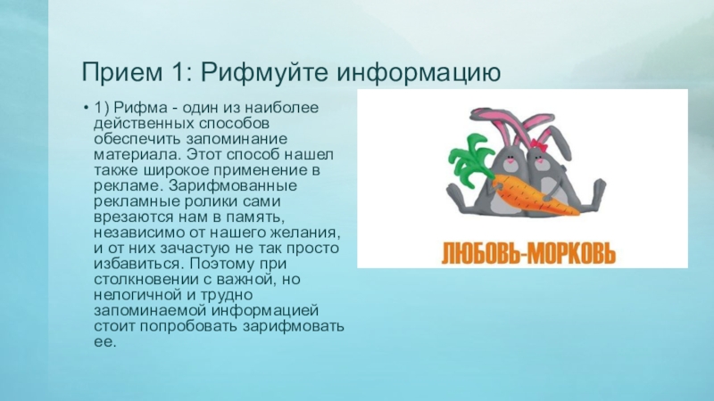 обеспечить запоминание материала. Этот способ нашел также широкое применение в рекламе. Зарифмованные рекламные ролики сами врезаются нам в память, независимо от нашего желания, и от них зачастую не так просто избавиться. Поэтому при столкновении с важной, но нелогичной и трудно запоминаемой информацией стоит попробовать зарифмовать ее.