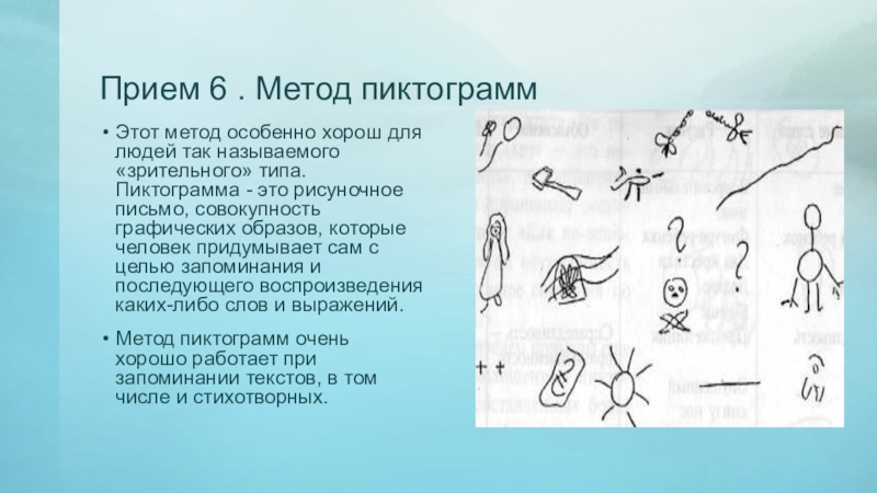 Метод пиктограмм очень хорошо работает при запоминании текстов, в том числе и стихотворных.