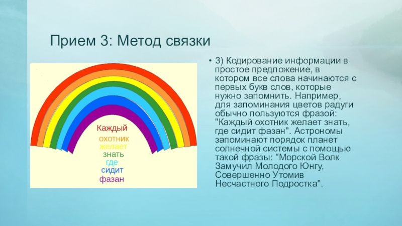 котором все слова начинаются с первых букв слов, которые нужно запомнить. Например, для запоминания цветов радуги обычно пользуются фразой: "Каждый охотник желает знать, где сидит фазан". Астрономы запоминают порядок планет солнечной системы с помощью такой фразы: "Морской Волк Замучил Молодого Юнгу, Совершенно Утомив Несчастного Подростка".