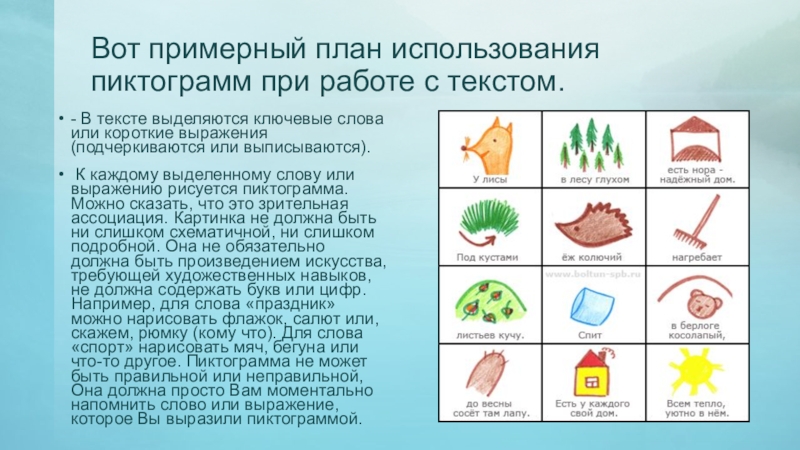 Слайд 9Вот примерный план использования пиктограмм при работе с текстом.
