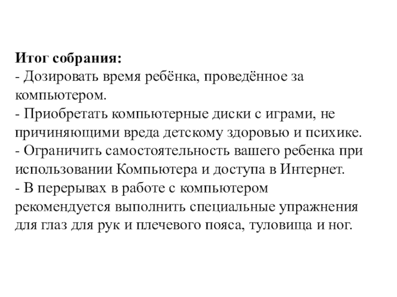 Убеждать родителей в необходимости дозировать время ребёнка, проведённое за компьютером.