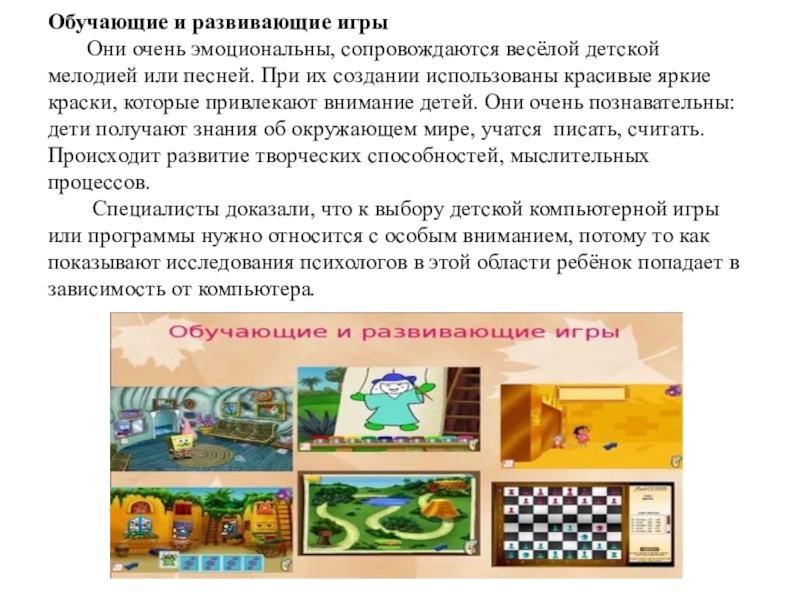 Специалисты доказали, что к выбору детской компьютерной игры или программы нужно относится с особым вниманием, потому то как показывают исследования психологов в этой области ребёнок попадает в зависимость от компьютера.