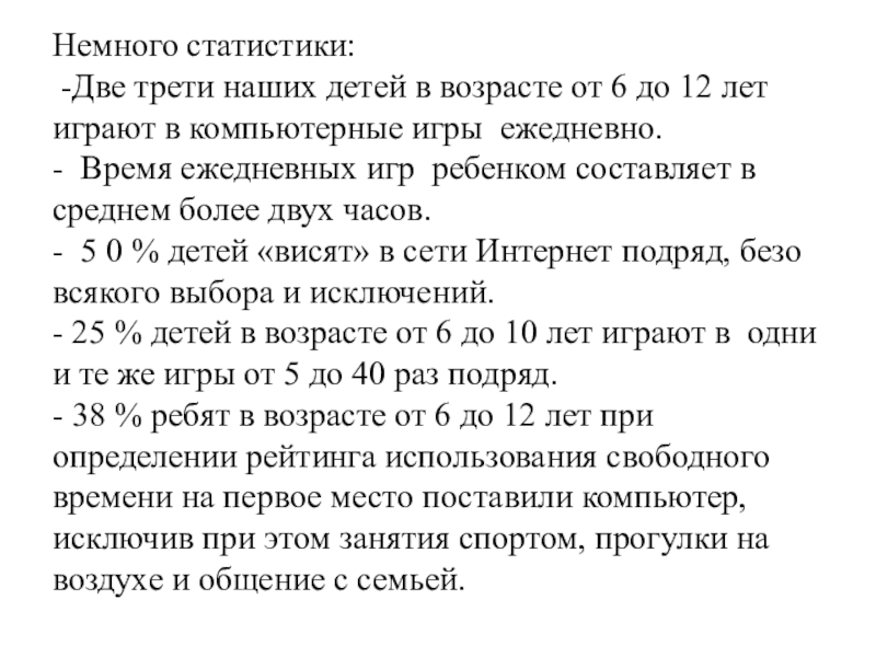 - 25 % детей в возрасте от 6 до 10 лет играют в одни и те же игры от 5 до 40 раз подряд.