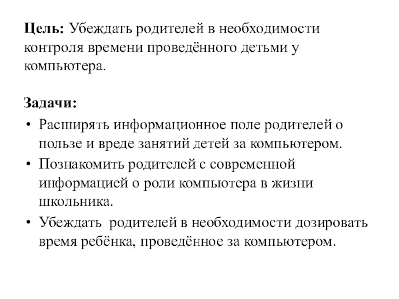 Цель: Убеждать родителей в необходимости контроля времени проведённого детьми у компьютера.