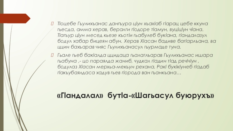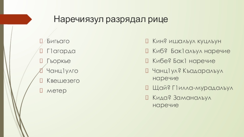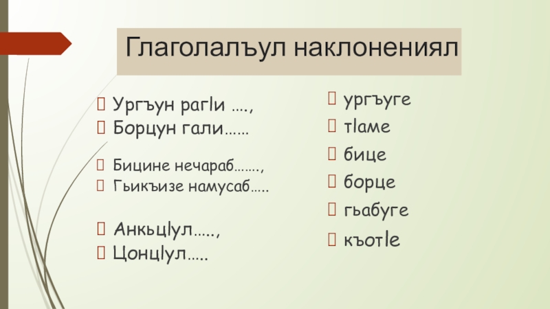Щай гурелъул, гьелъие гlоло, гьединлъидал, гьелдалъун, гlадин, кинигин.