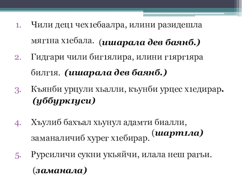 Слайд 14Чили дец1 чех1ебаалра, илини разидешла мяг1на х1ебала.