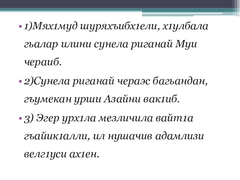 Слайд 171)Мях1муд шуряхъибх1ели, х1улбала гьалар илини сунела риганай Муи чераиб.