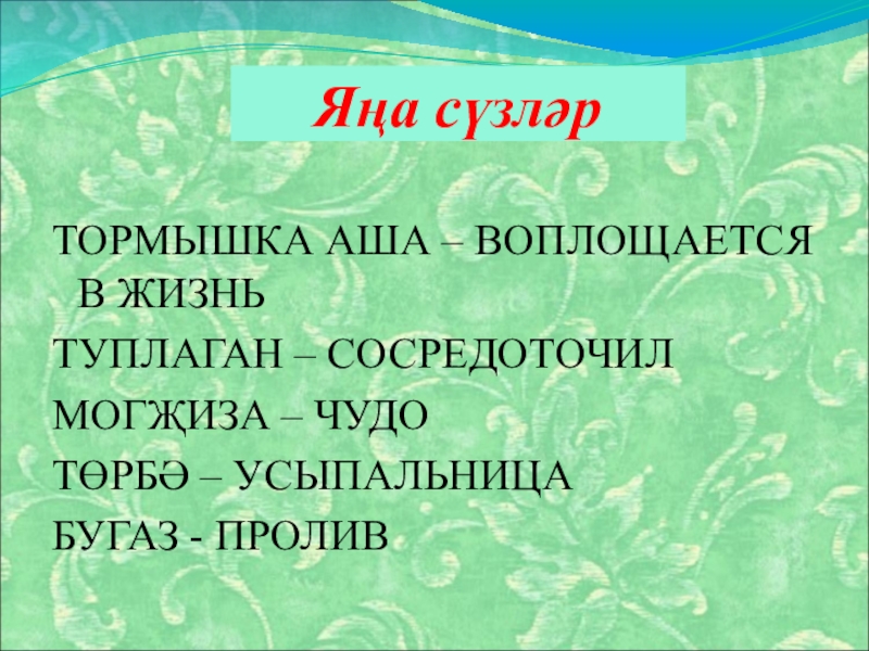 Яңа сүзләрТОРМЫШКА АША – ВОПЛОЩАЕТСЯ В ЖИЗНЬТУПЛАГАН – СОСРЕДОТОЧИЛМОГҖИЗА – ЧУДОТӨРБӘ – УСЫПАЛЬНИЦАБУГАЗ - ПРОЛИВ
