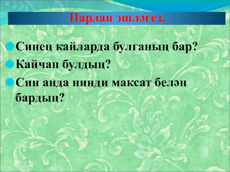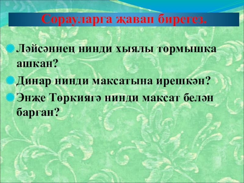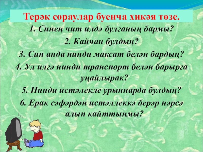 Слайд 12Терәк сораулар буенча хикәя төзе.