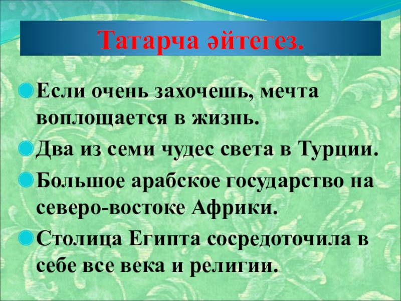 Татарча әйтегез.Если очень захочешь, мечта воплощается в жизнь. Два из семи чудес света в Турции.Большое арабское государство