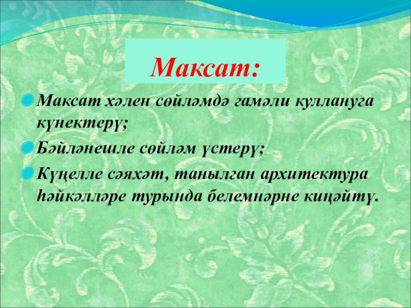 Максат:Максат хәлен сөйләмдә гамәли куллануга күнектерү;Бәйләнешле сөйләм үстерү;Күңелле сәяхәт, танылган архитектура һәйкәлләре турында белемнәрне киңәйтү.
