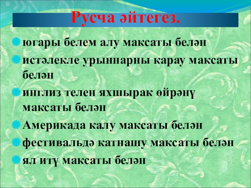 Русча әйтегез.югары белем алу максаты беләнистәлекле урыннарны карау максаты белән инглиз телен яхшырак өйрәнү максаты беләнАмерикада калу