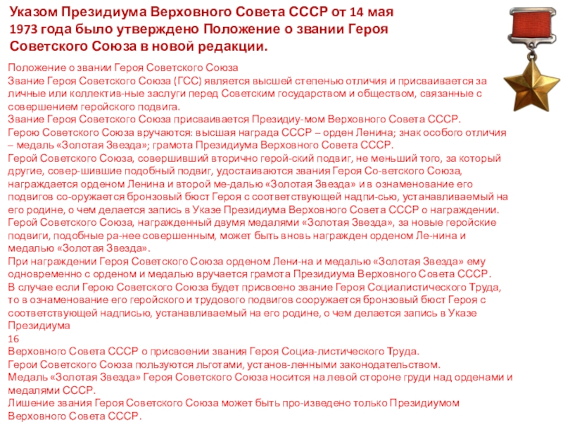 При награждении Героя Советского Союза орденом Лени-на и медалью «Золотая Звезда» ему одновременно с орденом и медалью вручается грамота Президиума Верховного Совета СССР.