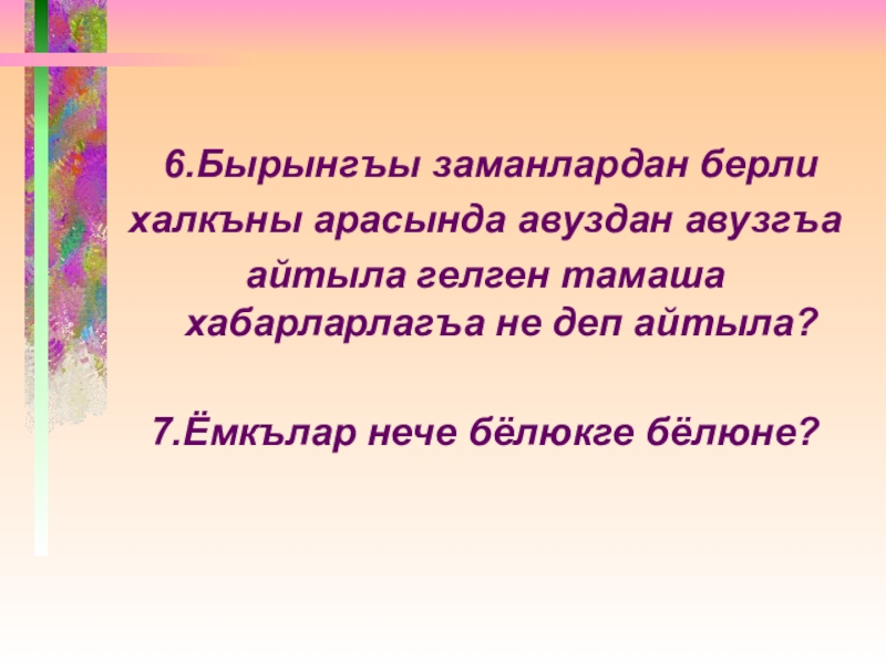 6.Бырынгъы заманлардан берли халкъны арасында авуздан авузгъа айтыла гелген тамаша хабарларлагъа не деп айтыла?  7.Ёмкълар