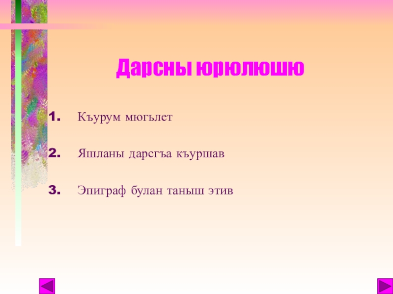 Слайд 3Дарсны юрюлюшю