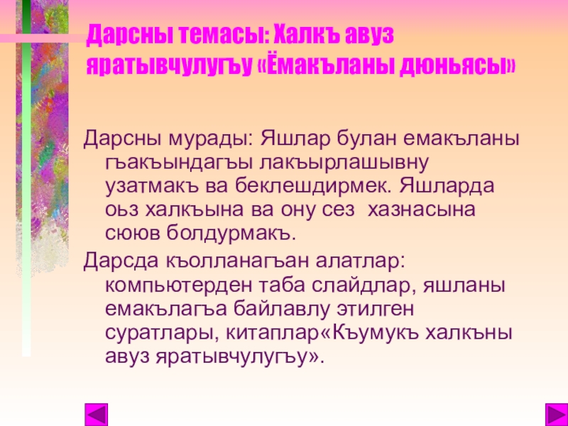 Дарсны темасы: Халкъ авуз яратывчулугъу «Ёмакъланы дюньясы»Дарсны мурады: Яшлар булан емакъланы гъакъындагъы лакъырлашывну узатмакъ ва беклешдирмек. Яшларда оьз халкъына ва ону сез хазнасына сююв болдурмакъ.Дарсда къолланагъан алатлар: компьютерден таба слайдлар, яшланы емакълагъа байлавлу этилген суратлары, китаплар«Къумукъ
