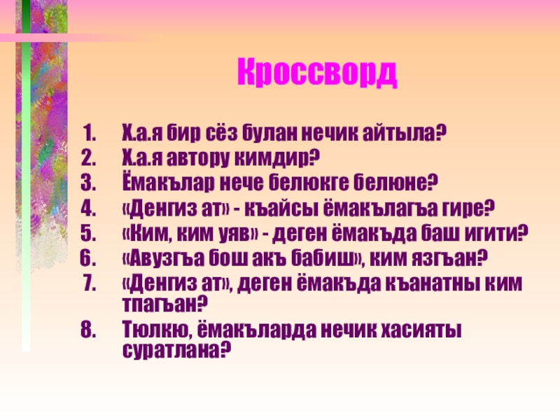 КроссвордХ.а.я бир сёз булан нечик айтыла? Х.а.я автору кимдир? Ёмакълар нече белюкге белюне?«Денгиз ат» - къайсы ёмакълагъа
