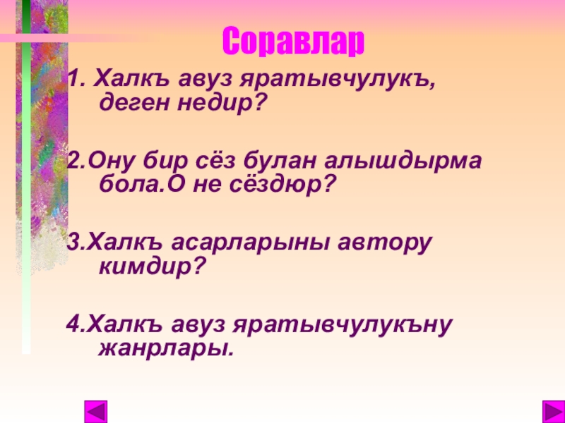 Соравлар1. Халкъ авуз яратывчулукъ, деген недир?2.Ону бир сёз булан алышдырма бола.О не сёздюр? 3.Халкъ асарларыны автору кимдир?4.Халкъ