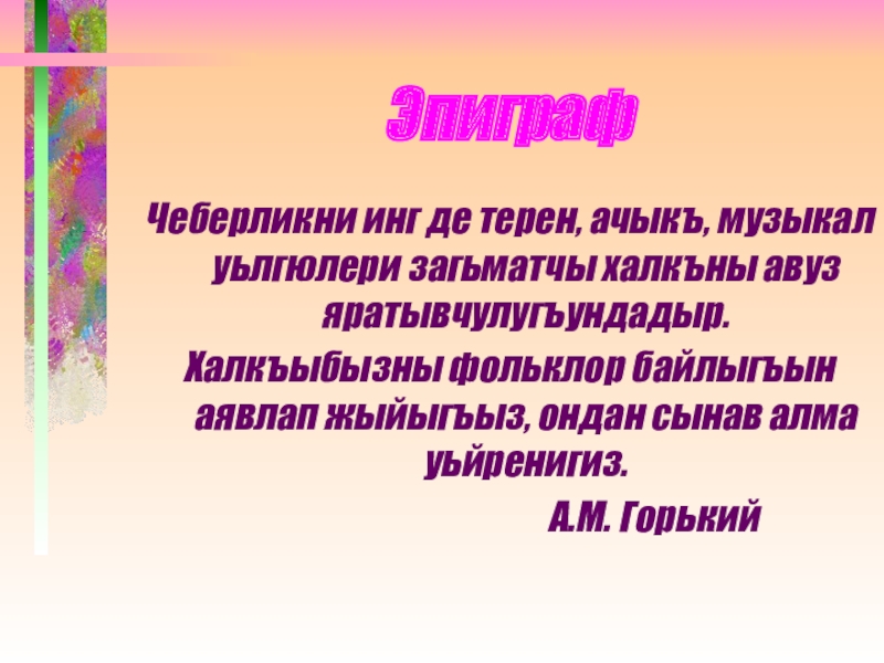 ЭпиграфЧеберликни инг де терен, ачыкъ, музыкал уьлгюлери загьматчы халкъны авуз яратывчулугъундадыр.Халкъыбызны фольклор байлыгъын аявлап жыйыгъыз, ондан сынав