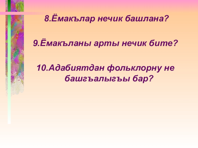 8.Ёмакълар нечик башлана?         9.Ёмакъланы арты нечик бите?