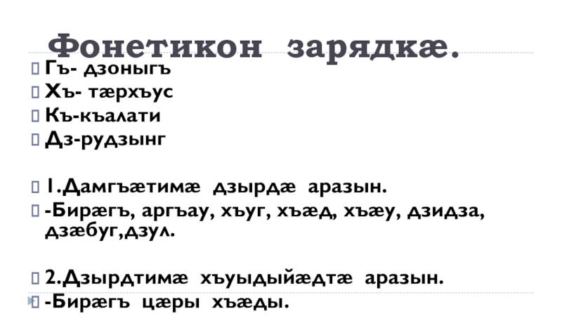 Фонетикон зарядкæ.Гъ- дзоныгъХъ- тæрхъусКъ-къалатиДз-рудзынг1.Дамгъæтимæ дзырдæ аразын.-Бирæгъ, аргъау, хъуг, хъæд, хъæу, дзидза, дзæбуг,дзул.2.Дзырдтимæ хъуыдыйæдтæ аразын.-Бирæгъ цæры хъæды.-Хъуг хизы