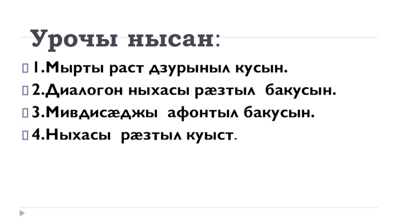 Урочы нысан:1.Мырты раст дзурыныл кусын.2.Диалогон ныхасы рæзтыл бакусын.3.Мивдисæджы афонтыл бакусын.4.Ныхасы рæзтыл куыст.