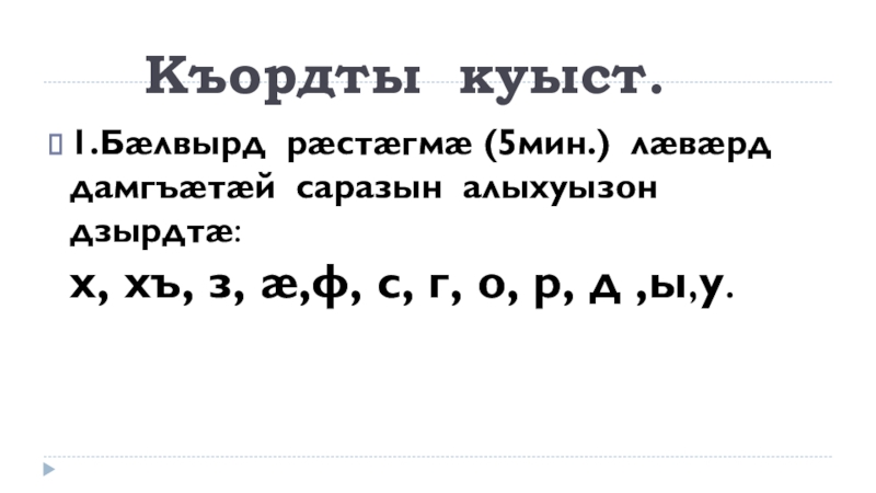 1.Бæлвырд рæстæгмæ (5мин.) лæвæрд дамгъæтæй саразын алыхуызон