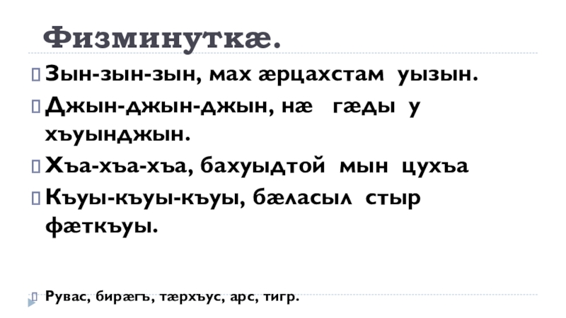 Физминуткæ.Зын-зын-зын, мах æрцахстам уызын.Джын-джын-джын, нæ  гæды у хъуынджын.Хъа-хъа-хъа, бахуыдтой мын цухъаКъуы-къуы-къуы, бæласыл стыр фæткъуы.Рувас, бирæгъ, тæрхъус,
