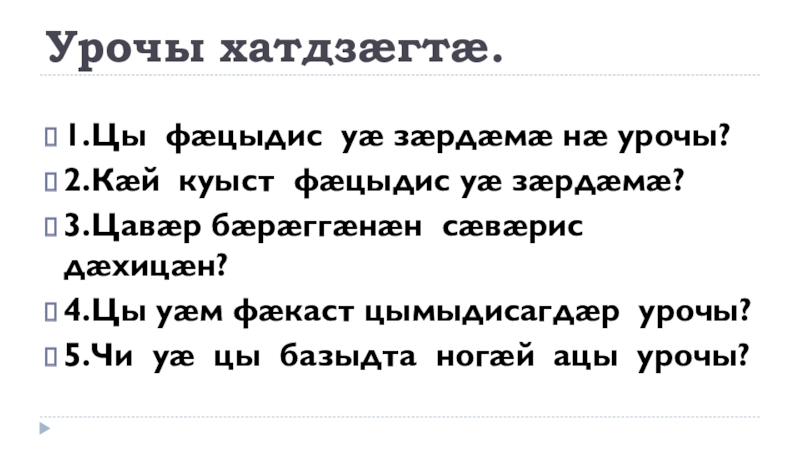 Урочы хатдзæгтæ.1.Цы фæцыдис уæ зæрдæмæ нæ урочы?2.Кæй куыст фæцыдис уæ зæрдæмæ?3.Цавæр бæрæггæнæн сæвæрис дæхицæн?4.Цы уæм фæкаст цымыдисагдæр