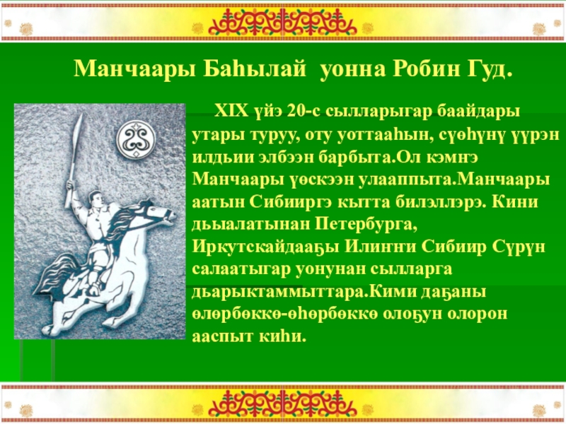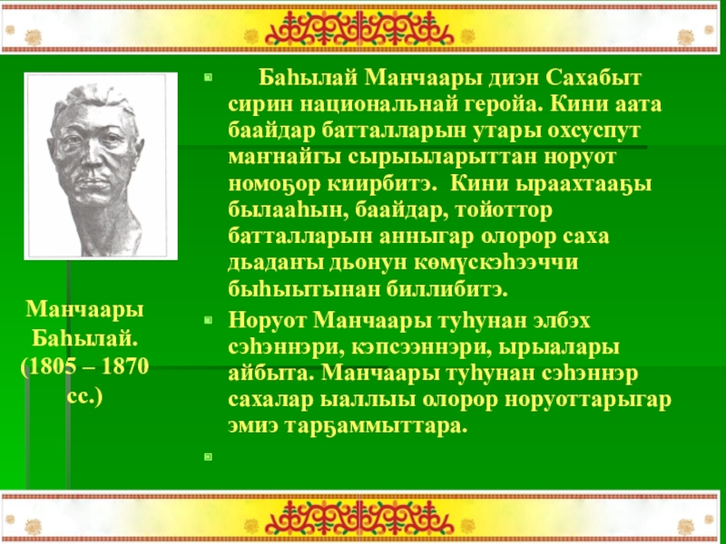Слайд 2 Баһылай Манчаары диэн Сахабыт сирин национальнай геройа. Кини
