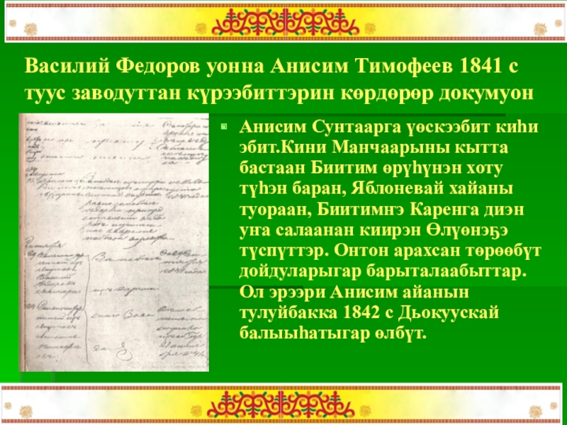 Слайд 18Василий Федоров уонна Анисим Тимофеев 1841 c туус заводуттан күрээбиттэрин көрдөрөр