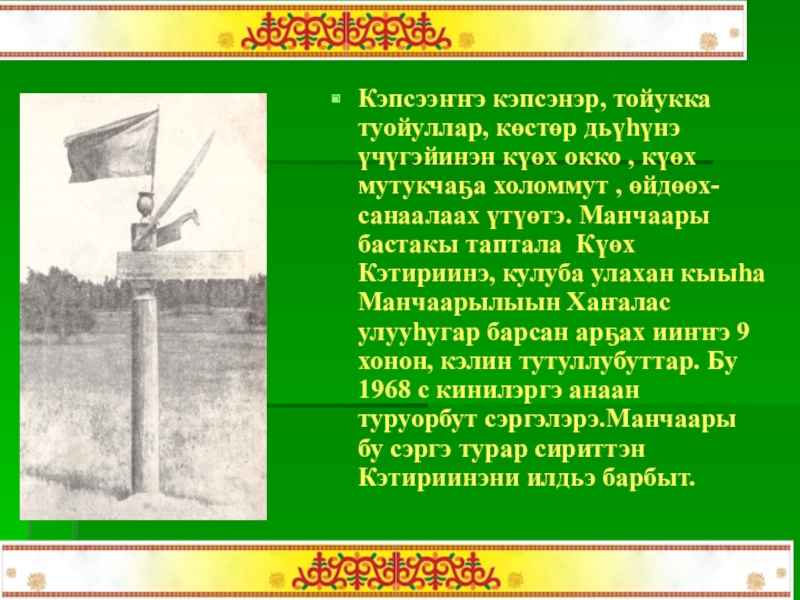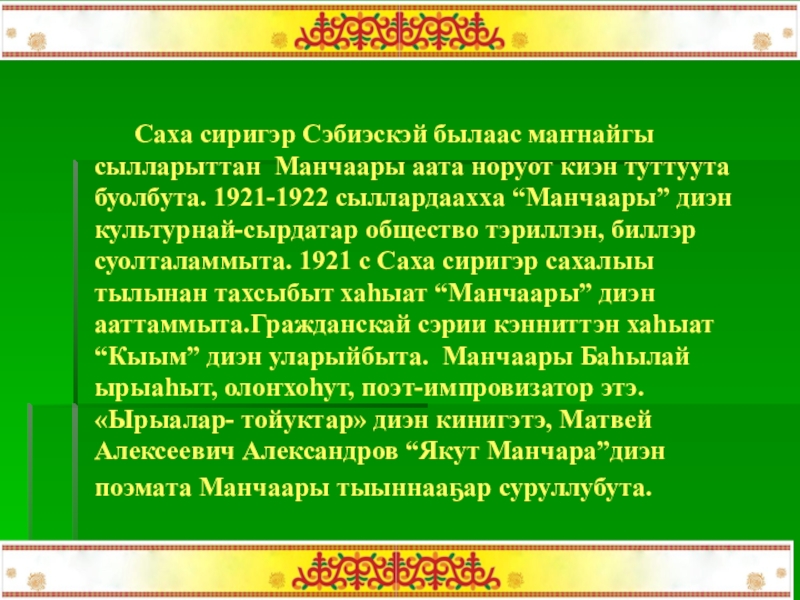 Слайд 22 Саха сиригэр Сэбиэскэй былаас маҥнайгы сылларыттан Манчаары аата норуот киэн туттуута