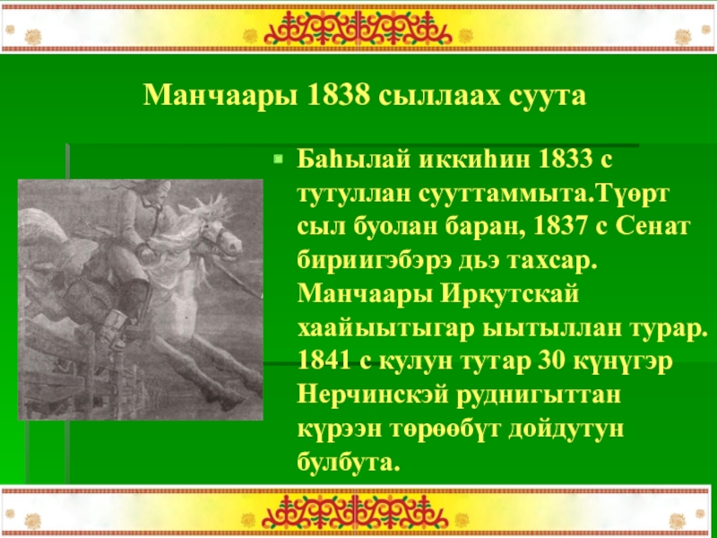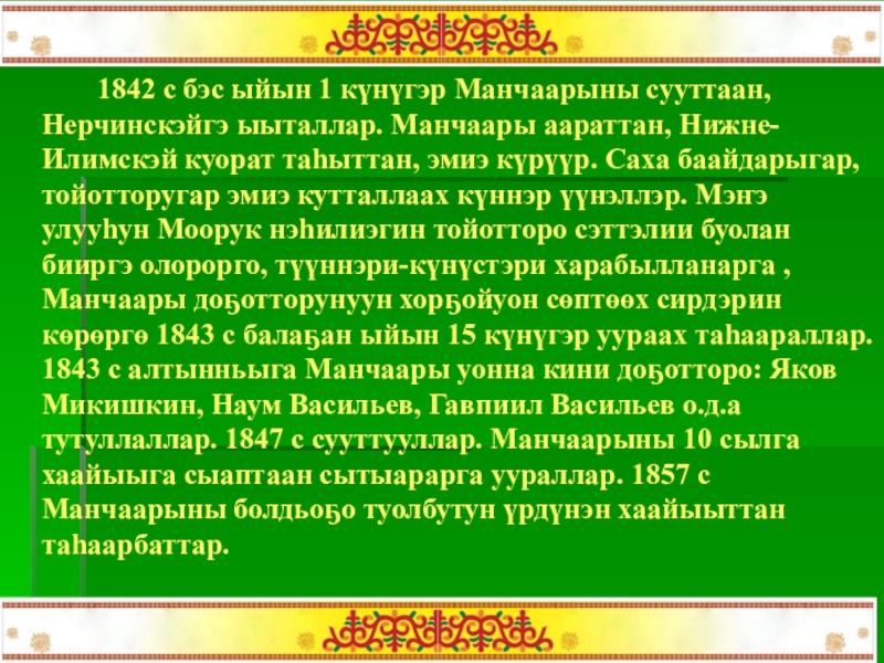 Слайд 19 1842 с бэс ыйын 1 күнүгэр Манчаарыны сууттаан, Нерчинскэйгэ ыыталлар. Манчаары