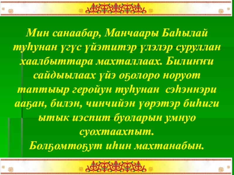 Слайд 37Мин санаабар, Манчаары Баһылай туһунан үгүс үйэтитэр үлэлэр суруллан хаалбыттара махталлаах.