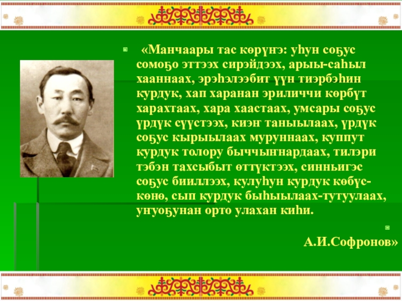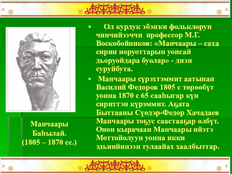 Слайд 1Саха национальнай геройа – Василий Федоров -Манчаары Баһылай.